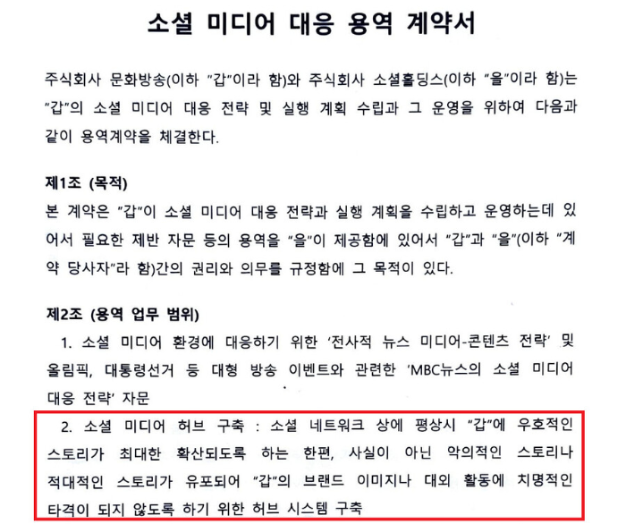 계약서는 2012년 5월 21일 MBC 내부 결재를 받았으며, 트위터 등 소셜미디어에서 자사에 유리한 정보를 확산시키고, 불리한 정보를 차단하는 전략을 담고 있습니다. 특히, 소셜미디어에서 MBC에 우호적인 스토리를 최대한 확산시키고, 악의적이고 적대적인 스토리를 막기 위한 허브 구축 내용이 명시되어 있습니다.
